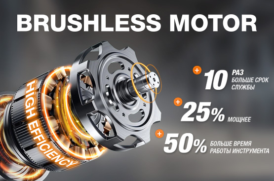 Бесщеточный двигатель обеспечивает высокую мощность при меньшем потреблении энергии, что позволять работать до 30% времени дольше на одном заряде аккумулятора.